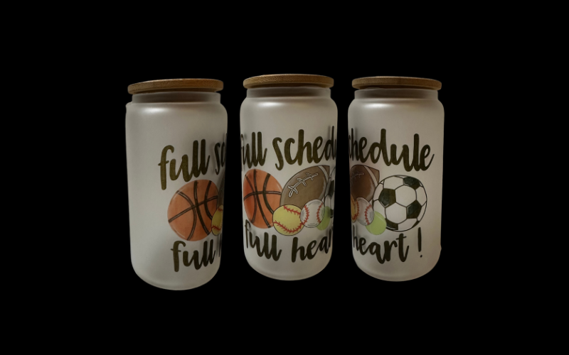 16oz Sublimation Glass Can that comes with a bamboo lid, straw, and white box.