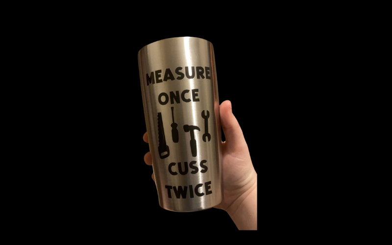 Measure your drink and your cuts with this manly 200z. Tapered Tumbler in "Measure Twice" design. Perfect for tool enthusiasts, this tumbler is both functional and stylish. Cheers to precision!