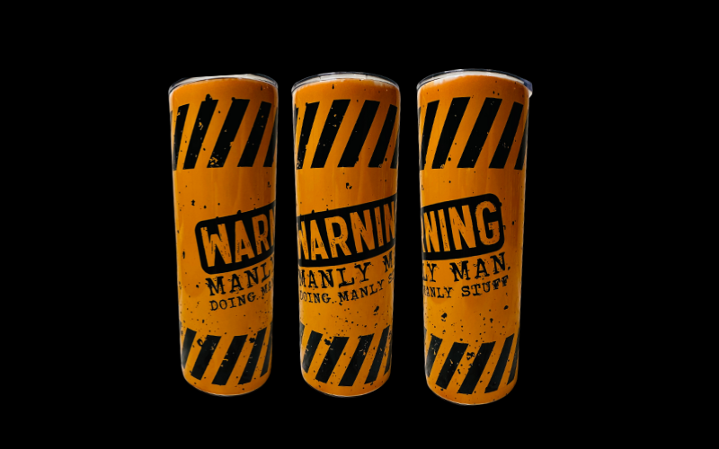 20oz. Tumbler sublimated with "Warning Manly Man Doing Manly Things" design. Comes in a white box and has a lid and clear straw. The lid has a slide to prevent leaks.