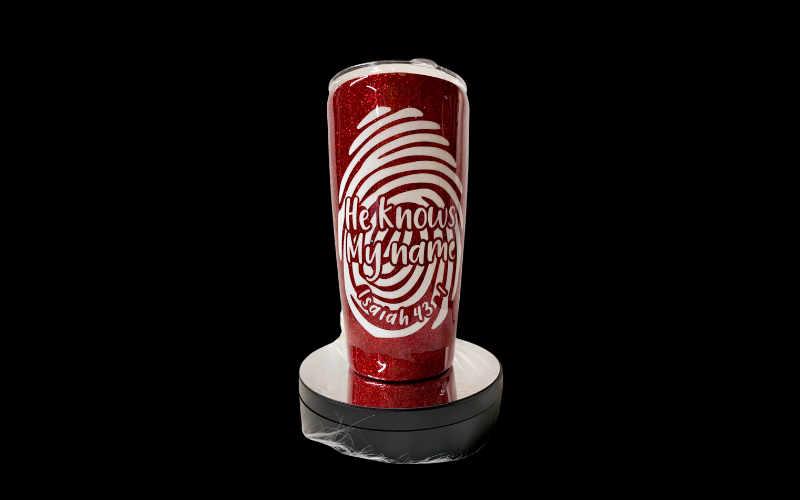 20oz Tapered Glitter Tumbler with "He knows My Name" design. Comes with a clear straw, white box and clear lid.