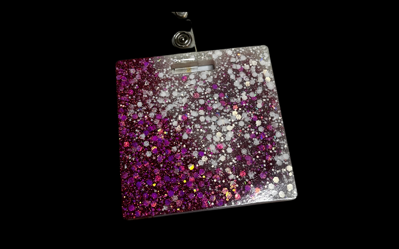 This glittery, sparkly badge reel holder in pink and silver is a stylish way to keep your ID badge secure and easily accessible. Add some sparkle to your work attire and never lose your badge again with this square-shaped holder. Perfect for adding a touch of personality to any office ensemble.
