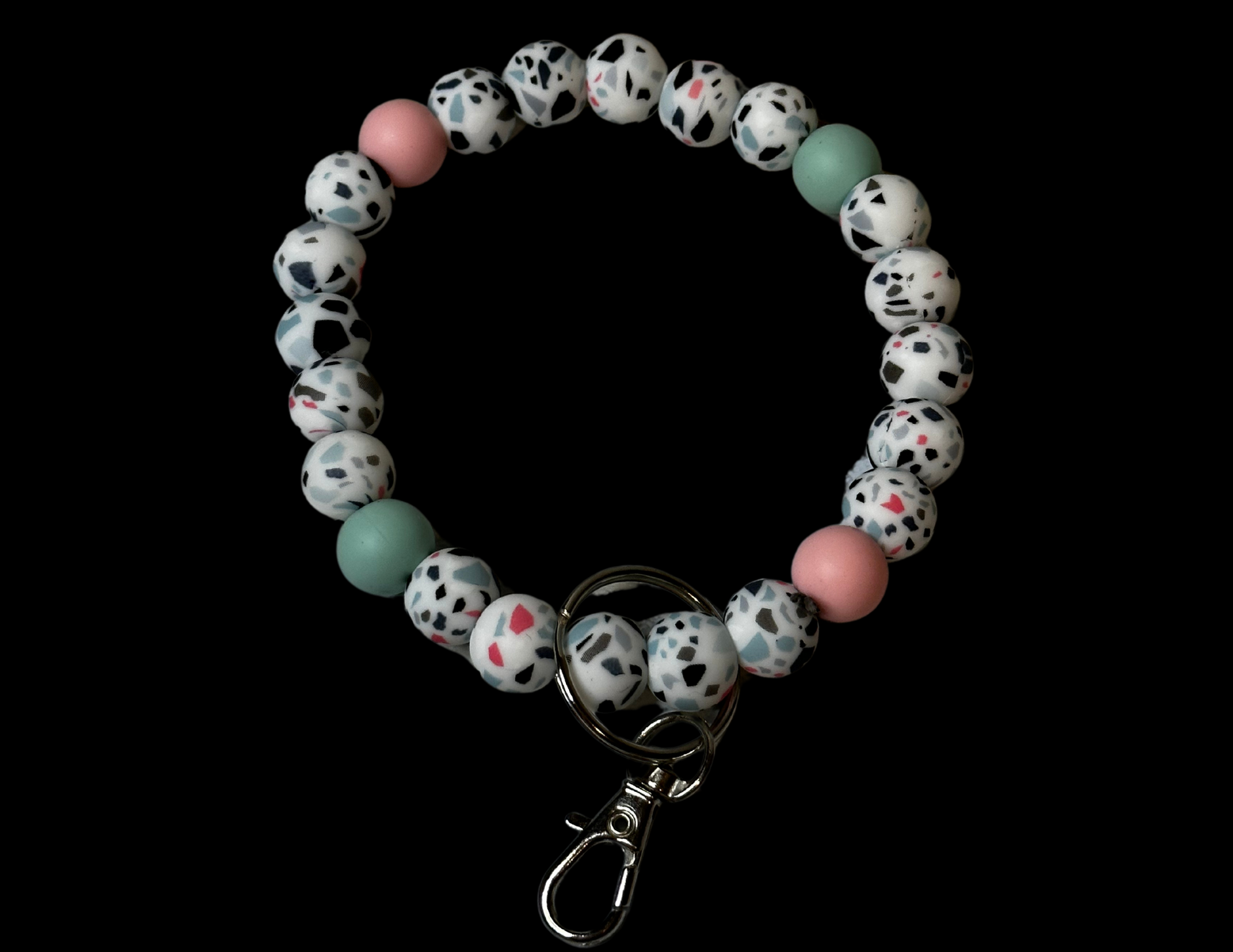 Bubble keychain wristlet that has 4 accent beads in a soft pink and green.