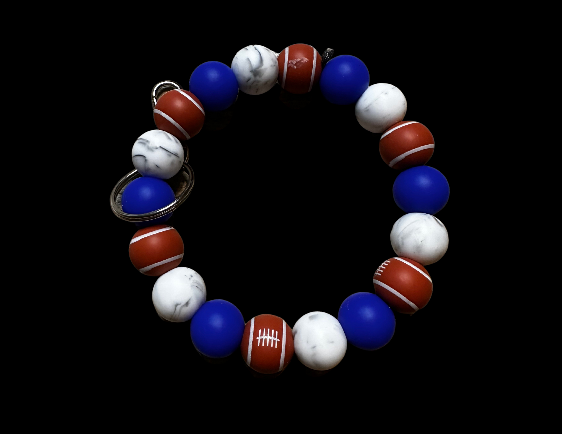 Bubble keychain wristlet that has football accent beads with blue and white solid beads.