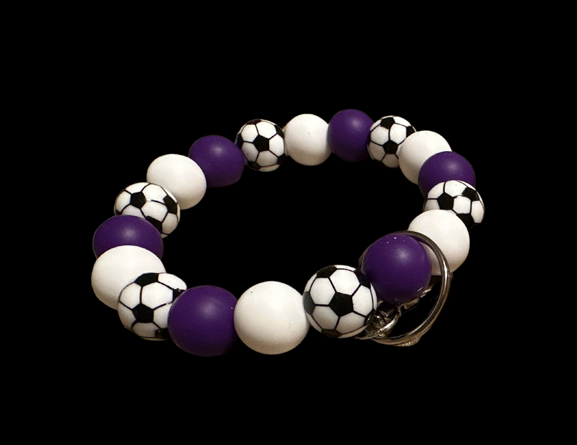 Bubble keychain wristlet that has soccer ball accent beads and purple beads.