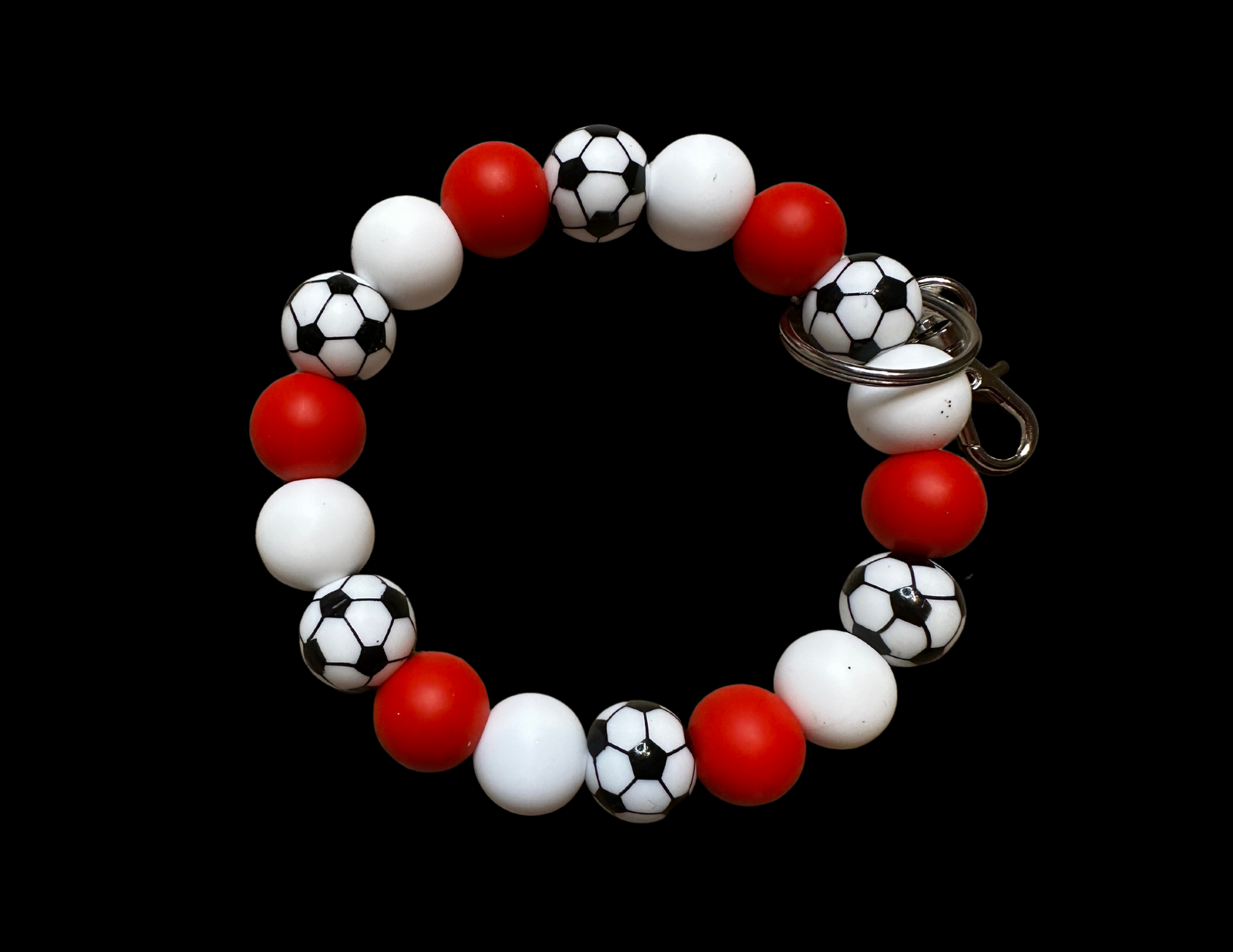 Bubble keychain wristlet that has soccer beads as accents and black and red beads.