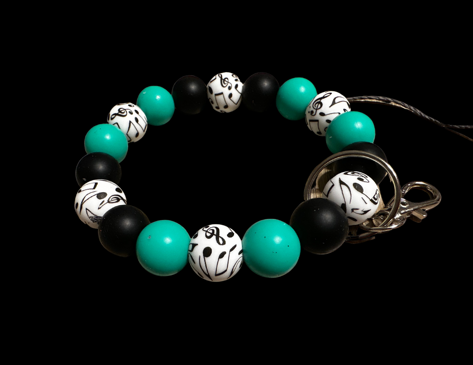 Bubble keychain wristlet that has accent beads that are music notes with a white background along with a teal bead.
