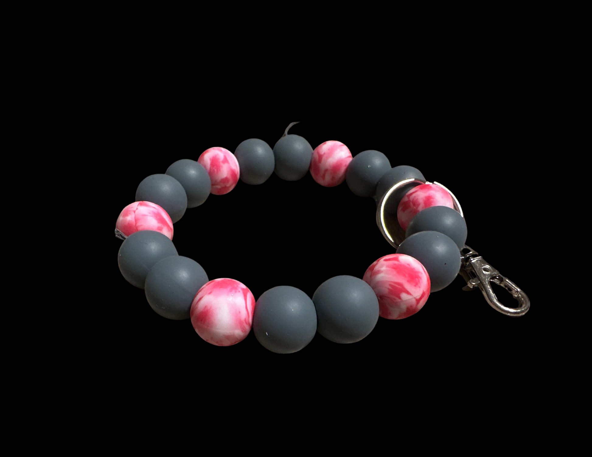 Bubble keychain wristlet that has pink marbled beads alongside gray marbled beads.