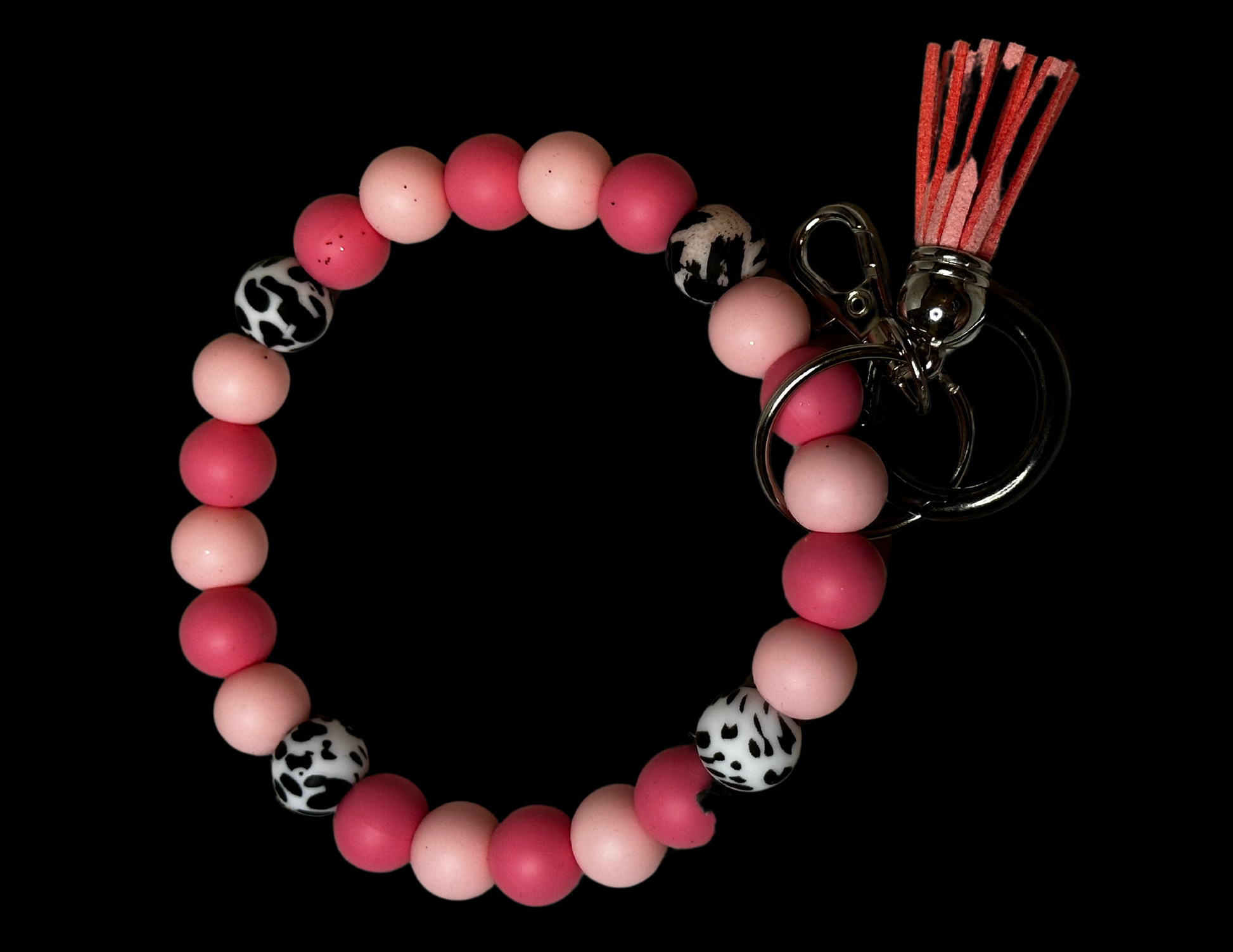 Bubble keychain wristlet that has 4 accent beads in a cow print.