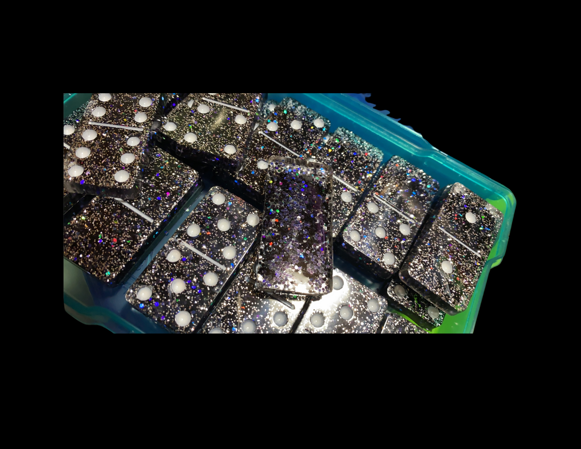 Add some sparkle to your game night with Dominos: Black Glitter. These eye-catching dominos are covered in black glitter dots, adding a touch of glamour and fun to any game. Perfect for parties or a fun night in with friends. Let the good times roll with Black Glitter Dominos!