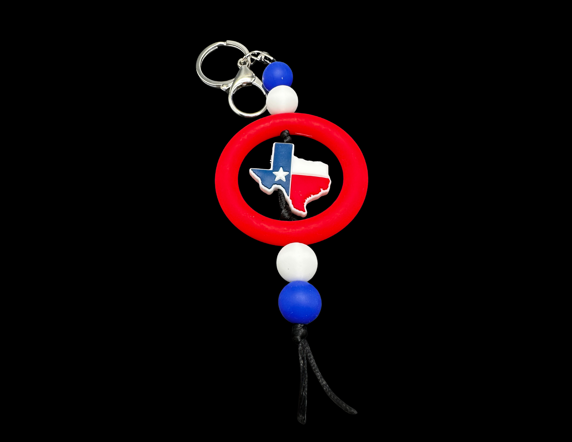 This silicone keychain featuring the shape of Texas is both practical and stylish. Made from durable silicone material, it securely holds your keys while adding a touch of personality to your everyday items. Perfect for those who love to show off their Texas pride in a unique way.