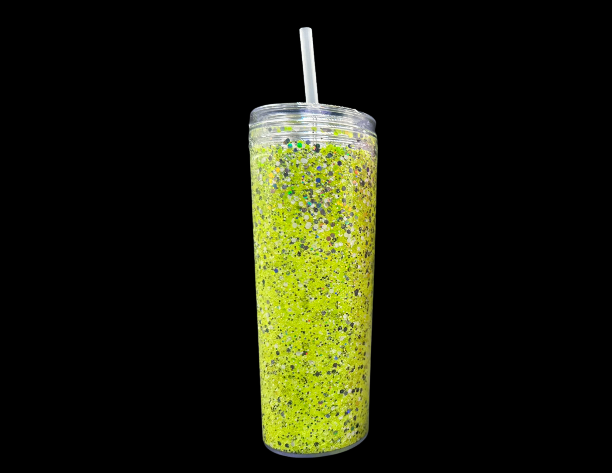 Experience a unique drinking experience with our Snowglobe Tumbler in Electric Lime. The tumbler's snowglobe design allows for a mesmerizing swirl of glitter with every sip, making it perfect for parties or any special occasion. Stay hydrated and stylish with this one-of-a-kind tumbler. (*All glitter ill vary slightly from pictures)